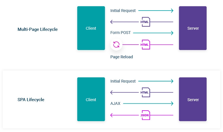 MPA (Multi Page Application) ์์ ์๋ ์๋ฒ๋ก ์ฐ๋ฆฌ๊ฐ ์ํ๋ url์ ๋ณด๋ด๋ฉด ์๋ฒ๋ ํด๋น url์ ํด๋นํ๋ html์ ๋ณด๋ด์ฃผ๊ณ ๋ธ๋ผ์ฐ์ ๋ ๋ ๋๋ง ํด์ฃผ๋ ๋ฐฉ์์ผ๋ก ์ฌ์ฉ๋์๋ค. Web์ ๋ฐ์ ๊ณผ Javascript์ ๋ฐ์ ์ผ๋ก ๋น๋๊ธฐ ์ฒ๋ฆฌ๊ฐ ๊ฐ๋ฅํด ์ง๋ฉด์, ๊ธฐ์กด์ MPA์์ ๊ฐ์ง, ์ ๋ฐ์ดํธ ๋ ํ๋ฉด์ ๋ณด์ฌ์ฃผ๊ธฐ ์ํด ์๋ก์ด HTML ์ ์ฒด๋ฅผ ๋ฐ์ ์์ผ ํ๋ ๋ฌธ์ ์ ์ ํด๊ฒฐํ ์ ์์๋ค. ์ฌ๋ฌ ๊ฐ์ ํ์ด์ง๋ฅผ ๋ค ๋ฐ์์ค์ง ์๊ณ ๋ฐ์ ๋ Javascript๋ฅผ ์ด์ฉํด ๋จ ํ๋์ html๋ง ๋ฐ์ ์์, Javascript๋ก ๋์ ์ผ๋ก Dom ์์๋ค์ ๋ณํํ๋ SPA (Single Page Application)๋ฐฉ์์ด ์์๋์๋ค.