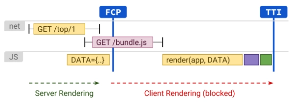 universal rendering์์๋ ์ด์ ๋์ผํ๊ฒ ์๋ฒ์์๋ ํด๋น ํ์ด์ง ๋ด์ฉ์ html ํ์ด์ง๋ฅผ ๋ฌธ์์ด๋ก ์ ๋ฌํด์ฃผ๊ณ , client์์๋ ์ ๋ฌ๋ฐ์ html ๋ฌธ์์ด์ ์ด์ฉํด ํ์ด์ง๋ฅผ ๋ง๋ค๊ณ , ์ ์ ํ ํจ์์ ์ด๋ฒคํธ๋ฅผ ๋ถ์ฌ์ค๋ค. ์ด๋ ๊ฒ ๋๊ฐ์ง ์ผ์ด ๋ถ๋ฆฌ๋์ด ์๊ธฐ ๋๋ฌธ์ javascript๋ฒ๋ค ํฌ๊ธฐ๊ฐ ํด ๊ฒฝ์ฐ์๋ ํ๋ฉด์ SSR์ฒ๋ผ ๋จผ์ ๋ณด์ด์ง๋ง TTI๋ ๋ฆ์ด์ง๋ ๋จ์ ์ ๊ฐ์ง ์ ์๋ค.