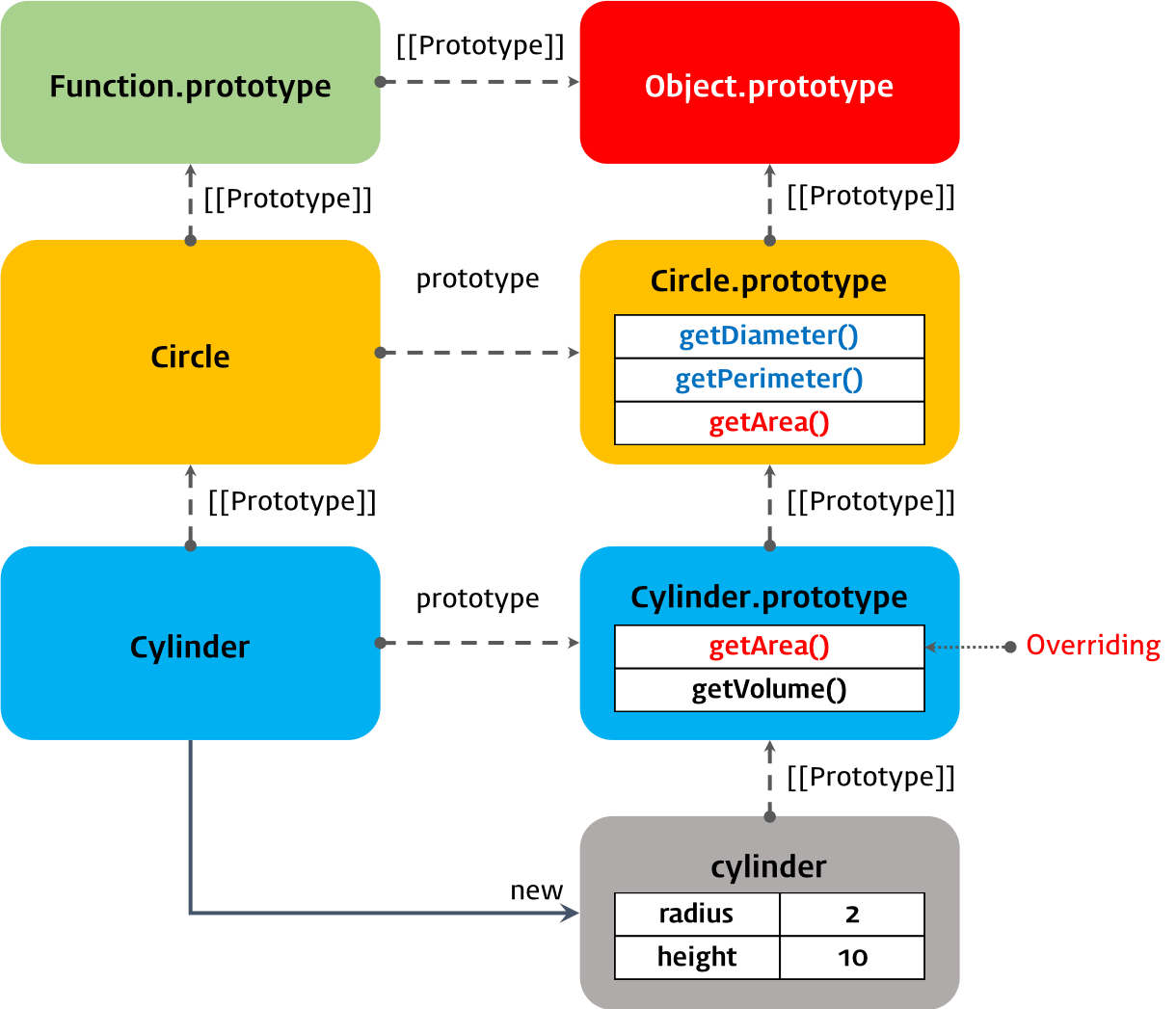 ์ฒด์ธ์์ Cylinder ํด๋์ค์ ์ํด override๋๋ฉด์ Circle.prototype ์ getArea๊ฐ ์๋ Cylinder.prototype์ getArea๋ก ํธ์ถ๋์ด ๊ฒฐ๊ณผ๊ฐ 4ฯ๊ฐ ์๋๋ผ 48ฯ์ ํด๋นํ๋ 150.79644737231007๋ก ๋ํ๋๋ค.