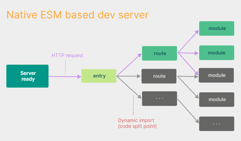 Vite๋ ๊ฐ๋ฐํ ๋ ์ฌ์ฉํ๋ ๊ฐ๋ฐ ์๋ฒ๋ฅผ ๊ตฌ๋ํ ๋ ๋น ๋ฅด๊ฒ ๋ฐ์ํ๊ธฐ ์ํด ํฌ๊ฒ dependencies์ source code๋ก ๊ตฌ๋ถํด, ๊ฐ๋ฐ ์์ ๋ด์ฉ์ด ๋ฐ๋์ง ์์ dependency์ ์ฝ๋๋ ES Build๋ก ์ฌ์ ๋ฒ๋ค๋ง์ ํ๊ณ , ๊ณ์ํด์ ์์ ํด์ผ ํ๋ source code ๋ ๋ธ๋ผ์ฐ์ ์ ESM์ ์ด์ฉํด์ ๋ฐ์ํ ์ ์๊ฒ ์ฒ๋ฆฌํ๋ค. ESM์ ์์ฒญ๋ฐ์ ๋ชจ๋๋ง ์ ๋ฌํ๊ธฐ ๋๋ฌธ์ ํจ์ฌ ๋น ๋ฅด๊ฒ ๊ฐ๋ฐ ์๋ฒ์ ๋ฐ์์ด ๊ฐ๋ฅํ๋ค.
