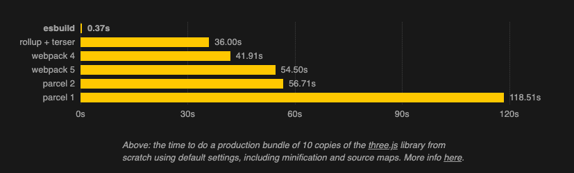 ์ด๋ฌํ ๋ฌธ์ ์ ์ ํด๊ฒฐํ๊ธฐ ์ํด ์๋ก์ด ๋๊ตฌ๋ก ES Build๊ฐ ๋ฑ์ฅํ๊ฒ ๋๋ค. ES Build๋ ๊ธฐ์กด ๋ฒ๋ค๋ฌ๋ค์ ์๋๋ณด๋ค 100๋ฐฐ ์ด์ ๋น ๋ฅธ ๋น๋ ์๋๋ฅผ ๊ฐ์ก๋ค. ์ด๋ ๊ฒ ๋น ๋ฅธ ์๋๋ฅผ ๊ฐ์ง๊ณ ์๋ ์ด์ ๋ JS๋ฅผ ๊ธฐ๋ฐ์ผ๋ก ๋ง๋ค์ด์ง ๊ธฐ์กด ๋ฒ๋ค๋ฌ๋ค๊ณผ ๋ฌ๋ฆฌ Go ์ธ์ด๋ก ์์ฑ๋์ด ๋น ๋ฅธ ๋น๋๊ฐ ๊ฐ๋ฅํ๊ธฐ ๋๋ฌธ์ด์๋ค. ํ์ง๋ง ๋ฒ๋ค๋ฌ๋ก์จ๋ง ์ฌ์ฉ๋๋ ๊ฒ์ด ์๋๋ผ HMR, code splitting๊ณผ ๊ฐ์ ๊ธฐ๋ฅ๋ค์ด ์ข