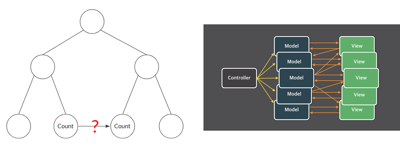 이렇게 복잡해져 가면서 기존 MVC 패턴에서 벗어나려는 움직임이 생기게 된다. 기존의 페이지 단위에서 컴포넌트 단위로 개발하려는 Component 패턴이 생기면서 컴포넌트 간의 데이터를 주고 받기에 어려운 Props Driling 문제가 생기게 된다. 각각의 컴포넌트가 다루는 데이터가 파편화 되면서 같은 레벨이지만 다른 부모 컴포넌트를 가질 경우 같은 데이터를 공유하기 어려운 문제가 생기게 된다.