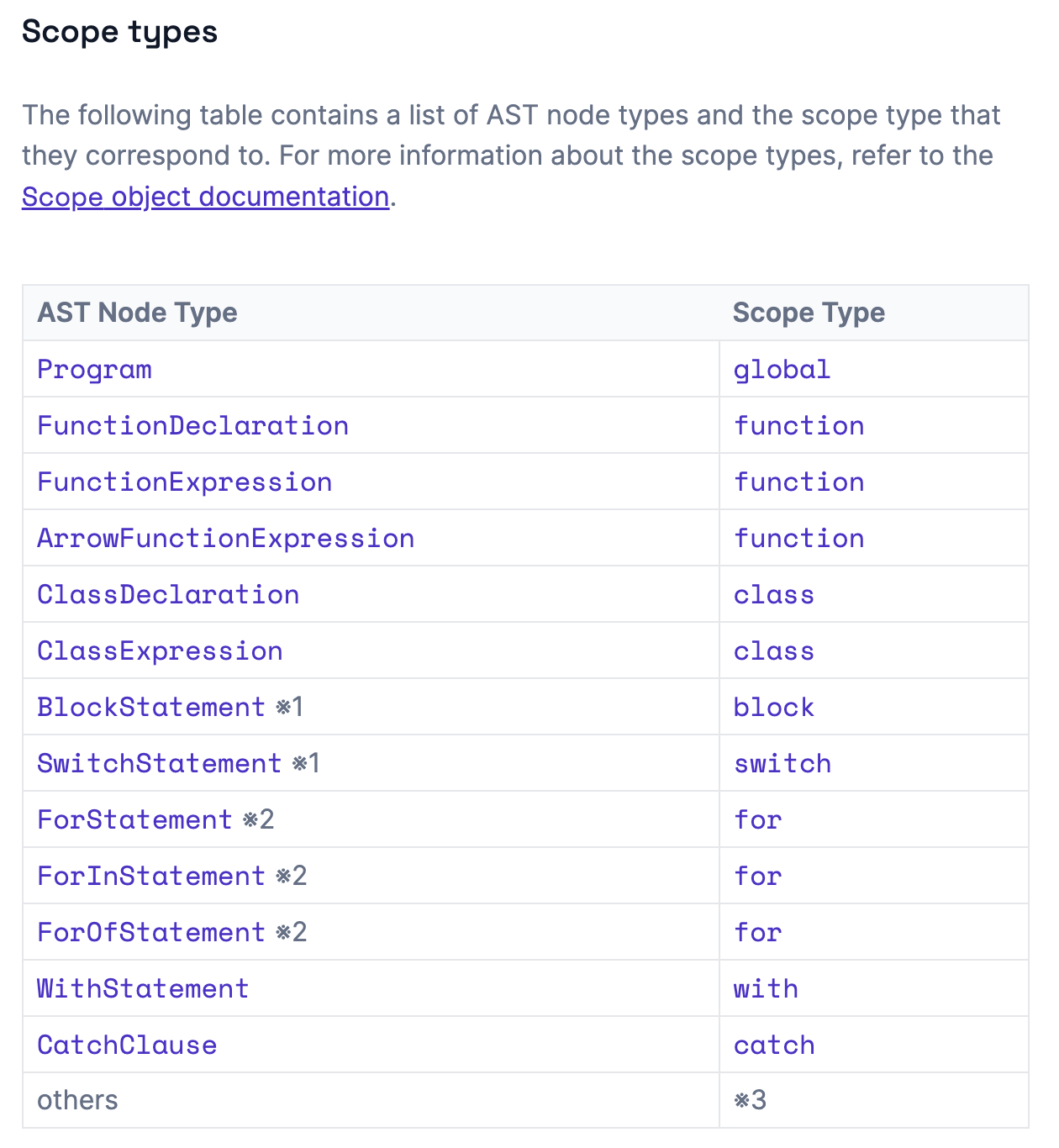 }여기서 내가 주요하게 봤던 부분은 scope 타입이 AST에서 특정되어 구분된다는 점이었다. 실제로 공식문서를 보았을 때 catch문은 CatchClause로 구분되어 적용할 수 있다.