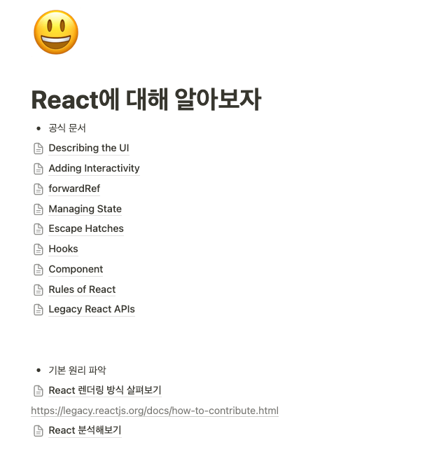 개인적으로 공부하고 있는 부분은 2월부터 계속해서 매일 리액트 공식문서의 한챕터씩 정리해보고 있다. 이제 거의 마무리되어서 다음 단계로 리액트 내부 코드들을 까보면서 각 요소가 직접 어떻게 동작하는지, 리액트의 특징이 어떻게 구현되어 있는지에 대해 공부해보려 한다.