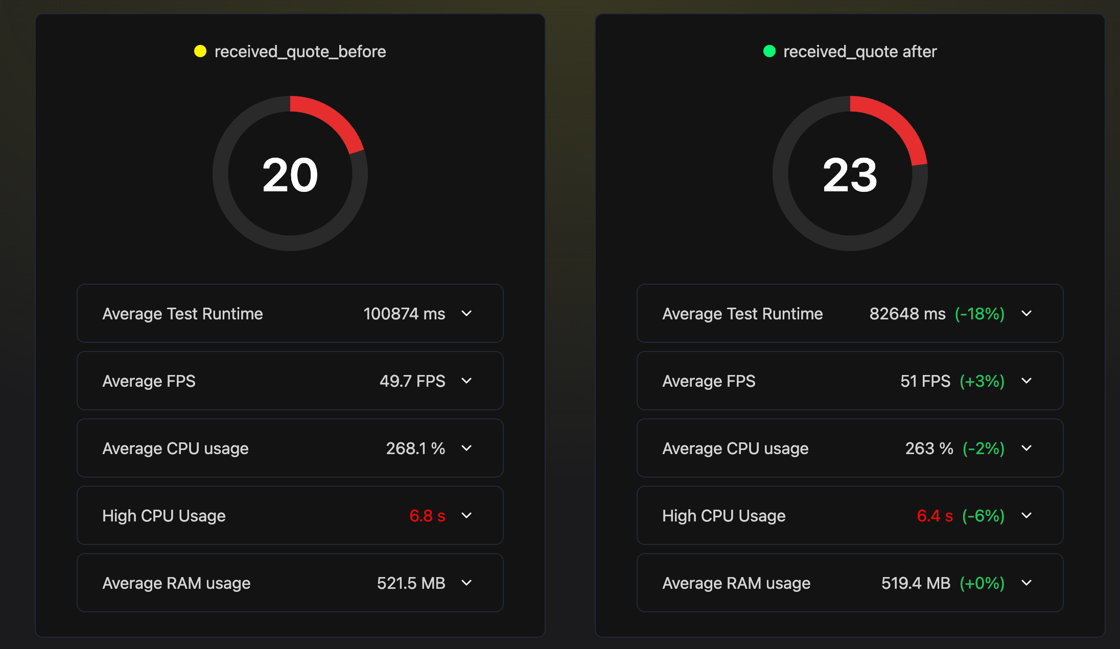 사진은 측정한 퍼널 중 하나의 퍼널 데이터이지만, 총 4가지 퍼널을 측정했을 때 CPU 사용량과 RAM 사용량은 전반적으로 감소되었다.